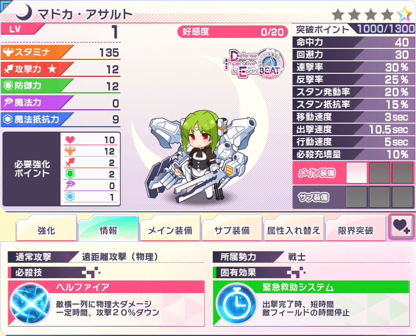 身にまとう重火器が頼もしい(?)、マドカのパラメータはこちらになります。