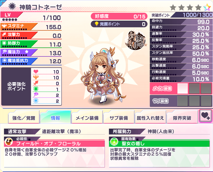 初期値&LV100(★3、必殺技・固有効果覚醒)時パラメータはこちらになります。