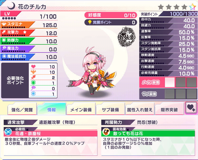 初期値&LV100(★5、必殺技・固有効果覚醒)時パラメータはこちらになります。