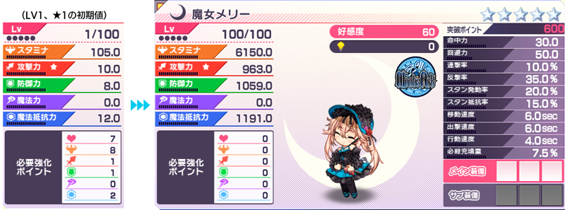 初期値&LV100★5でのパラメータはこちらになります。