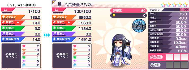 また、今回「期間限定ガチャ」にてピックアップされている、「八爪妖蠱ハツネ」