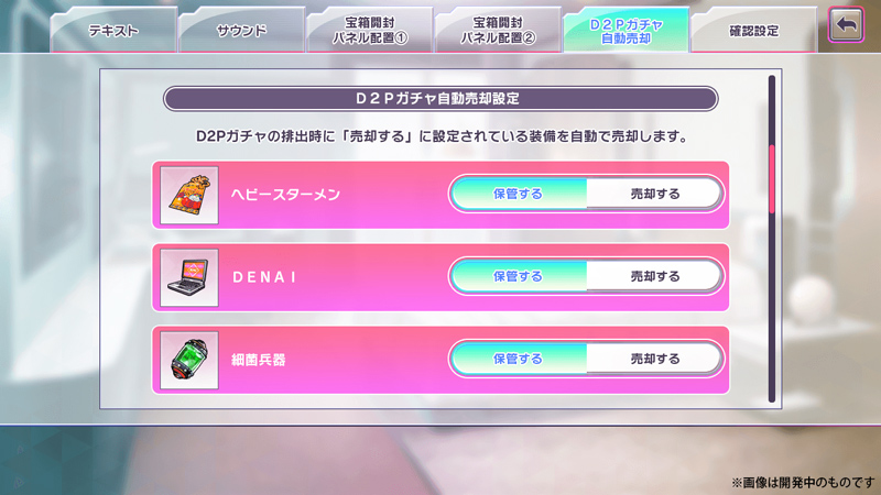 ○D2Pガチャ 排出された装備の自動売却機能の追加