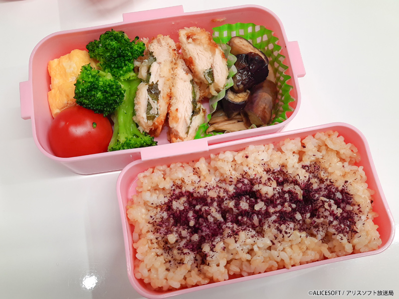写真の弁当はささみチーズかつ、なすとエリンギのバタポン、