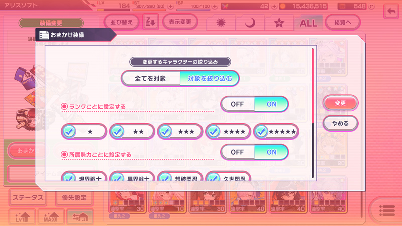 また、特定のレアリティや勢力、ランクのみを対象とすることも可能となっておりますので、