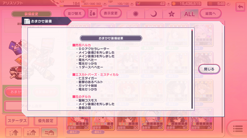 一定の法則で全キャラにおまかせで装備をおこなう「おまかせ装備機能」を追加しました。