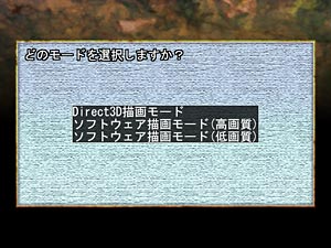 「RanceVI-ゼス崩壊-」では、 3種類の描画モードがあります。 ・Direct3D DirectX9.0に完全対応したVRAM64MB以上搭載のビデオカードを使用するモード (Radeon、GeForce推奨) ・ソフトウェア(高画質) Direct3Dを使わず、CPUのみで描画する ・ソフトウェア(低画質) ソフトウェア(高画質)で動作が重い人用 |